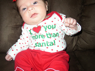 I'm so sad my baby girl has to get shots this week!!! :( I'm really not looking forward to it! My mom and Jonas are going with me, b/c I don't think I'll be able to handle it. I went with a friend of mine to have her daughter's done when I was 19 and absolutely lost it. No fun at all!!! She is getting so big. She figured out how to scream today. I thought she was crying and went to check on her and she was just as content as could be....screaming like a little girlie. It really was cute...she was having a ball with it! Here are some pics of my sweet baby. I could just eat her up!!!!